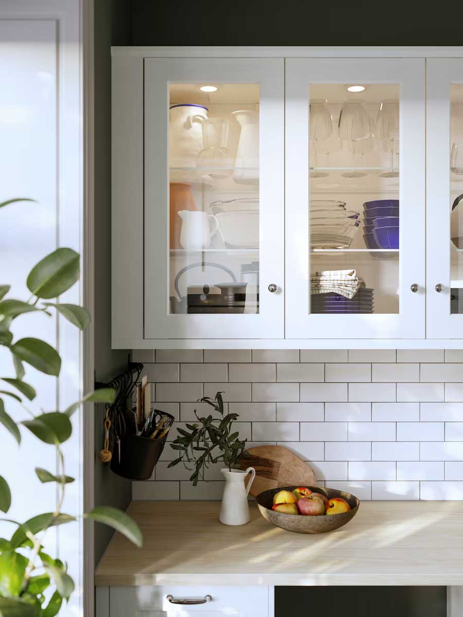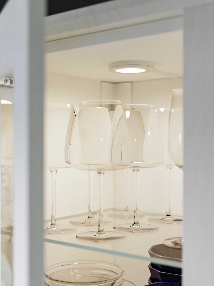 透過玻璃門來營造清透視覺感,同時由於玻璃能反射自然光,整個空間顯得更明亮寬敞。在玻璃門櫃裡加上能輕鬆安裝的可調光聚光燈,不但能創造氛圍,也讓心愛物品一覽無遺。