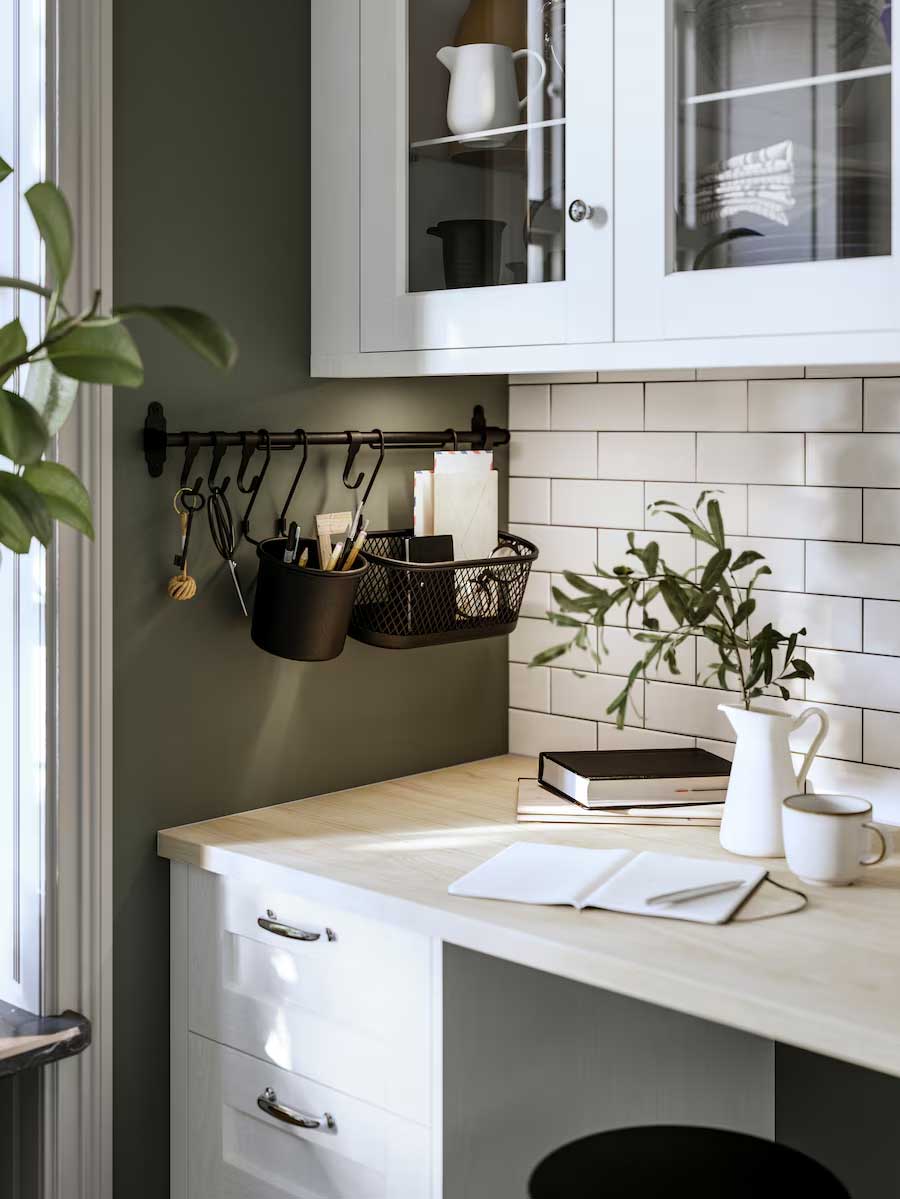 想要把廚房從雜亂無章變得明亮通風?把雜物全收進大抽屜是不行的,反而會因此找不到需要的物品。在牆面放置掛桿,搭配不同尺寸的掛鉤和收納容器,整齊收好筆、記事本、剪刀和備用鑰匙等小物。檯面重新回歸明亮平靜,讓你在這裡檢查信件、支付帳單,或者享受應得的休息時光。掛桿不僅帶來實用的收納,也能創造空間焦點,為廚房的整體風格畫龍點睛。