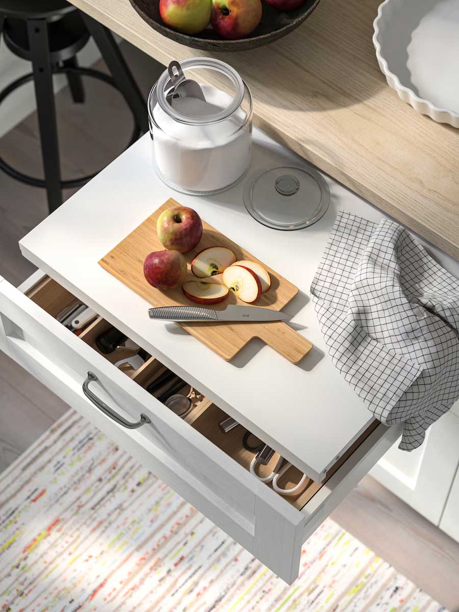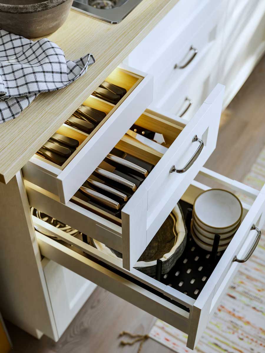 大抽屜常用來擺放廚具,但如果沒有好好整理,很容易變得雜亂無章。使用內部隔間將抽屜分成不同區塊,避免所有東西堆放在一起。巧妙利用洞洞板來放置碗盤,刀架能將刀具固定在適當位置,搭配餐具托盤分門別類收好刀叉和湯匙,所有的廚房物品都找到完美位置。這款收納櫃在外拉式抽屜門板內還有一個抽屜,讓你能夠完整利用整個櫥櫃高度,而不會破壞光滑的正面外表。廚房隨時保持流暢簡約,創造迷人的和諧氛圍。