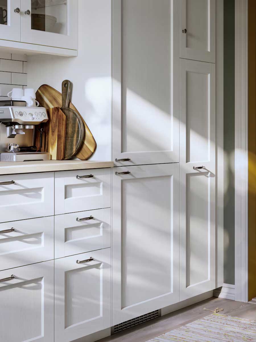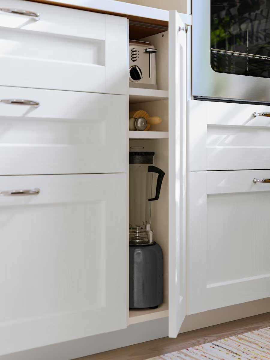 來到小廚房,善加利用每一寸空間來整齊收納。當物品都能在櫥櫃裡收得整齊有序,更能保持檯面清爽。將小家電完美放進窄櫃,不但方便拿取,關上光潔的櫃門,隨時保持寬敞舒適的廚房面貌。