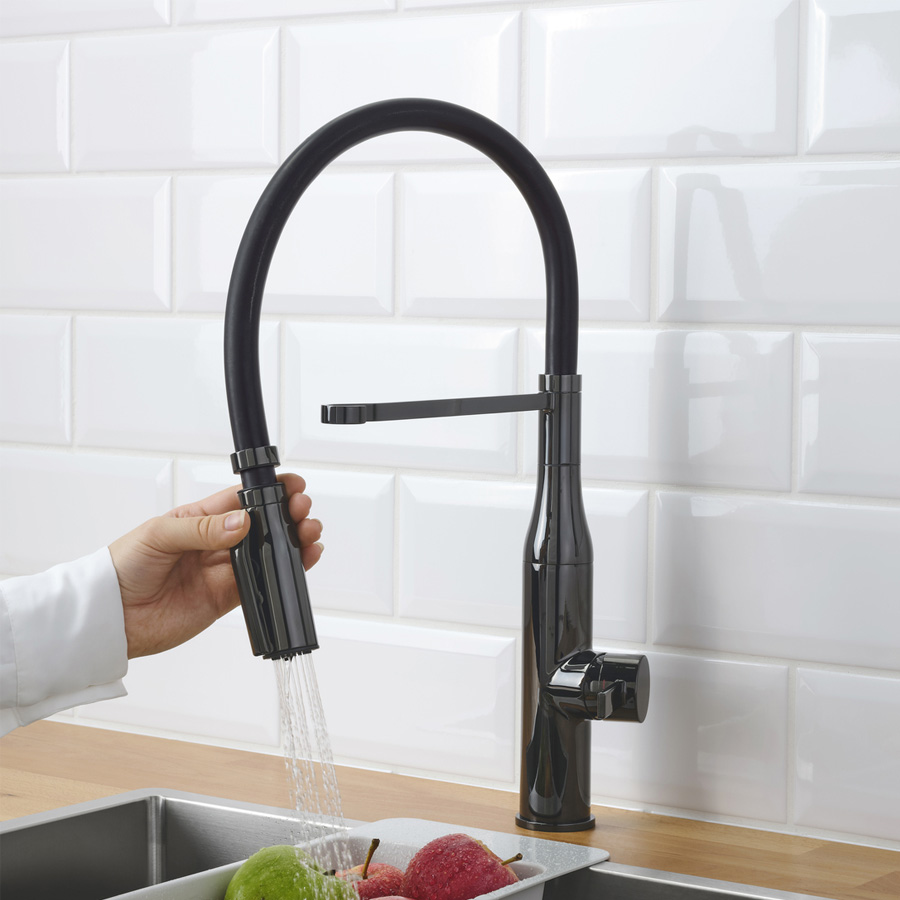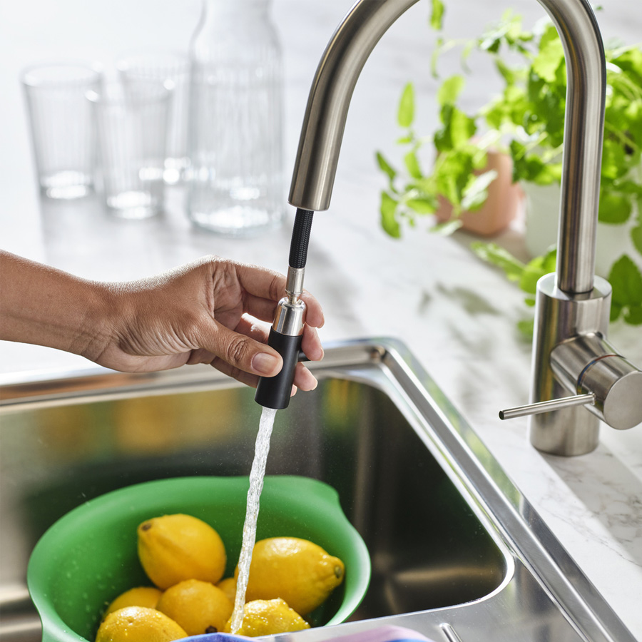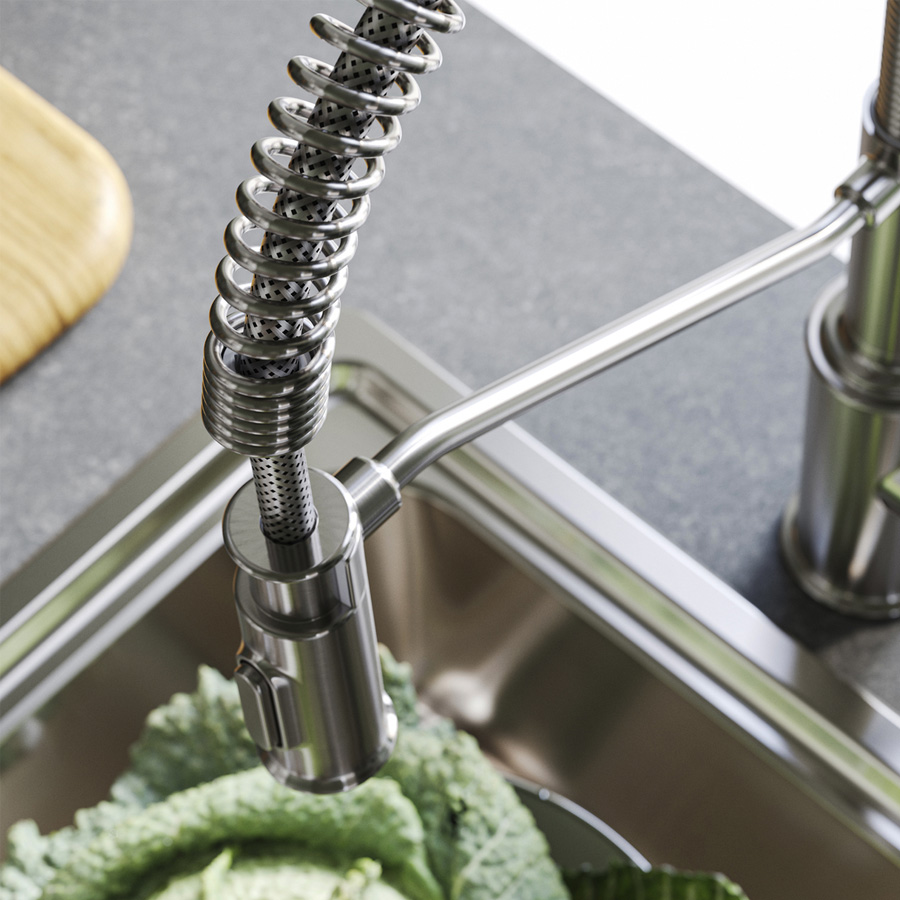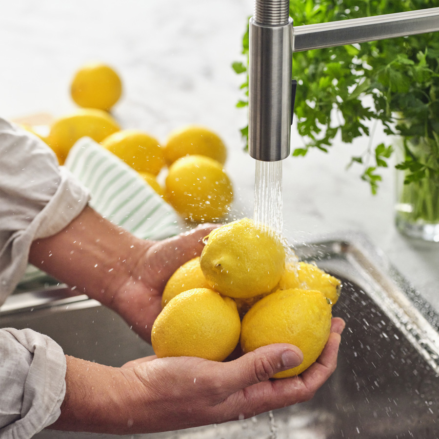 我們的水龍頭有外拉或下拉設計,延伸範圍更大;有些款式隱藏拉出軟管於經典外型中,有些則搭配彈簧噴頭,靈活好操作。所有水龍頭至少能旋轉 120 度,有些甚至可達 360 度,讓你在廚房工作時更自由。