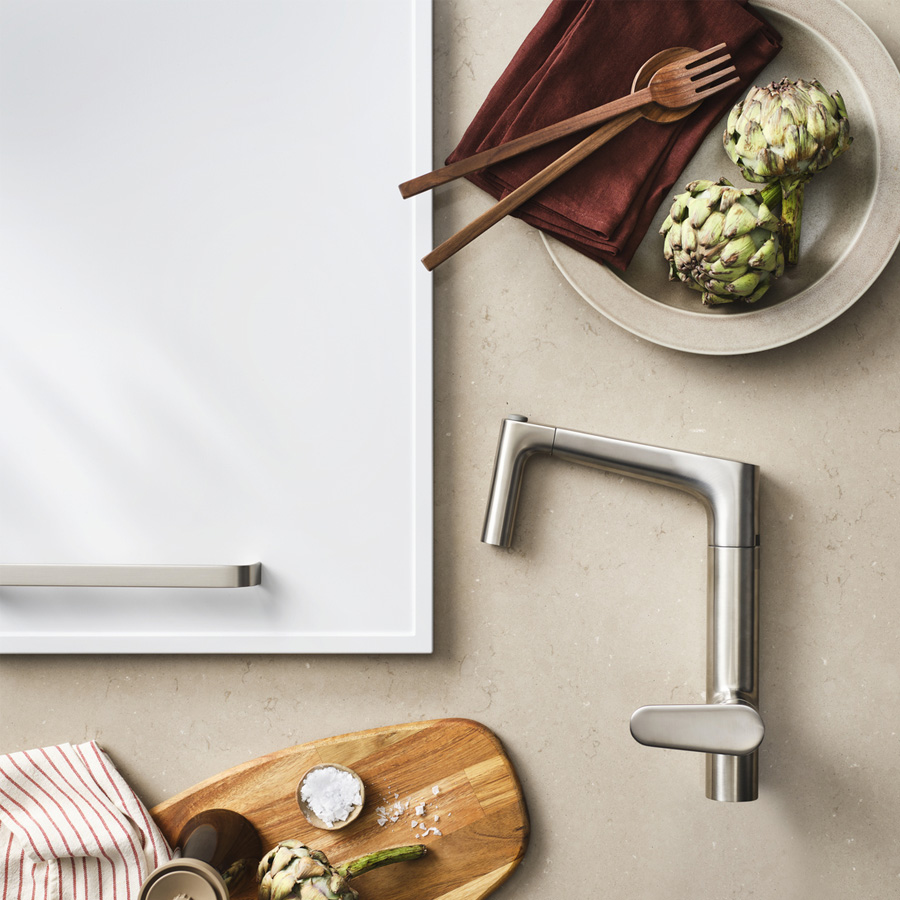 IKEA持續尋找新方法減少家中用水,同時維持良好體驗。所有的廚房水龍頭都配備加氣裝置,將空氣混入水流,保持適當水量又能節水。