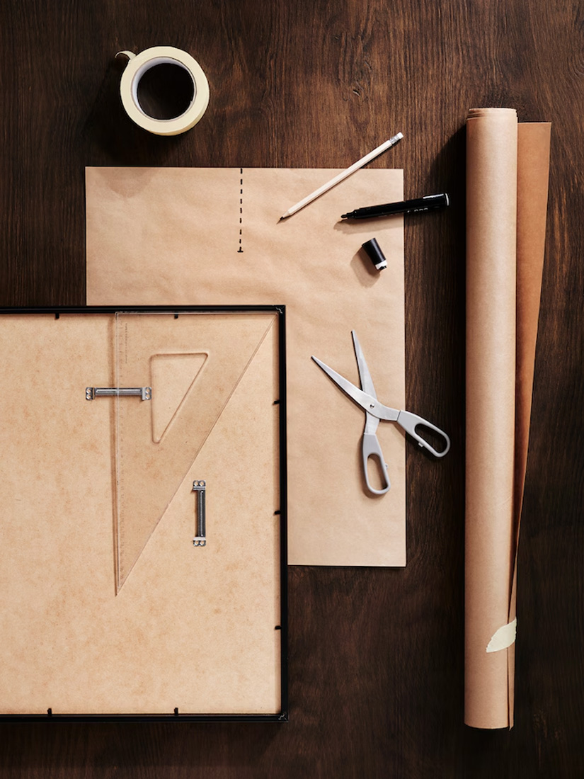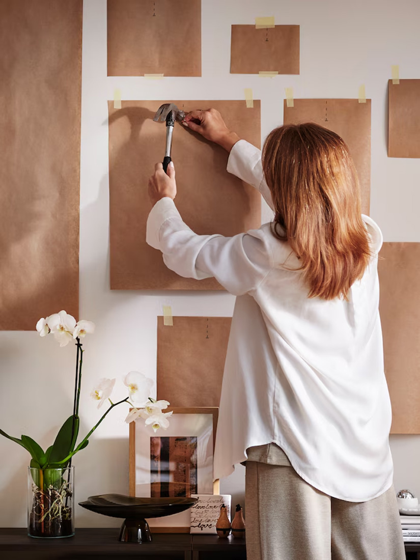 接下來,嘗試找到你喜歡的配置方式。可以先在地板上嘗試不同排列組合,這樣更容易調整。當你找到滿意的方案,再將剪下來的紙用膠帶貼到牆上,把掛鉤或釘子穿過上一步驟做出的標記處,安裝於牆面。