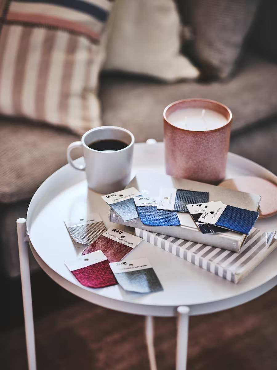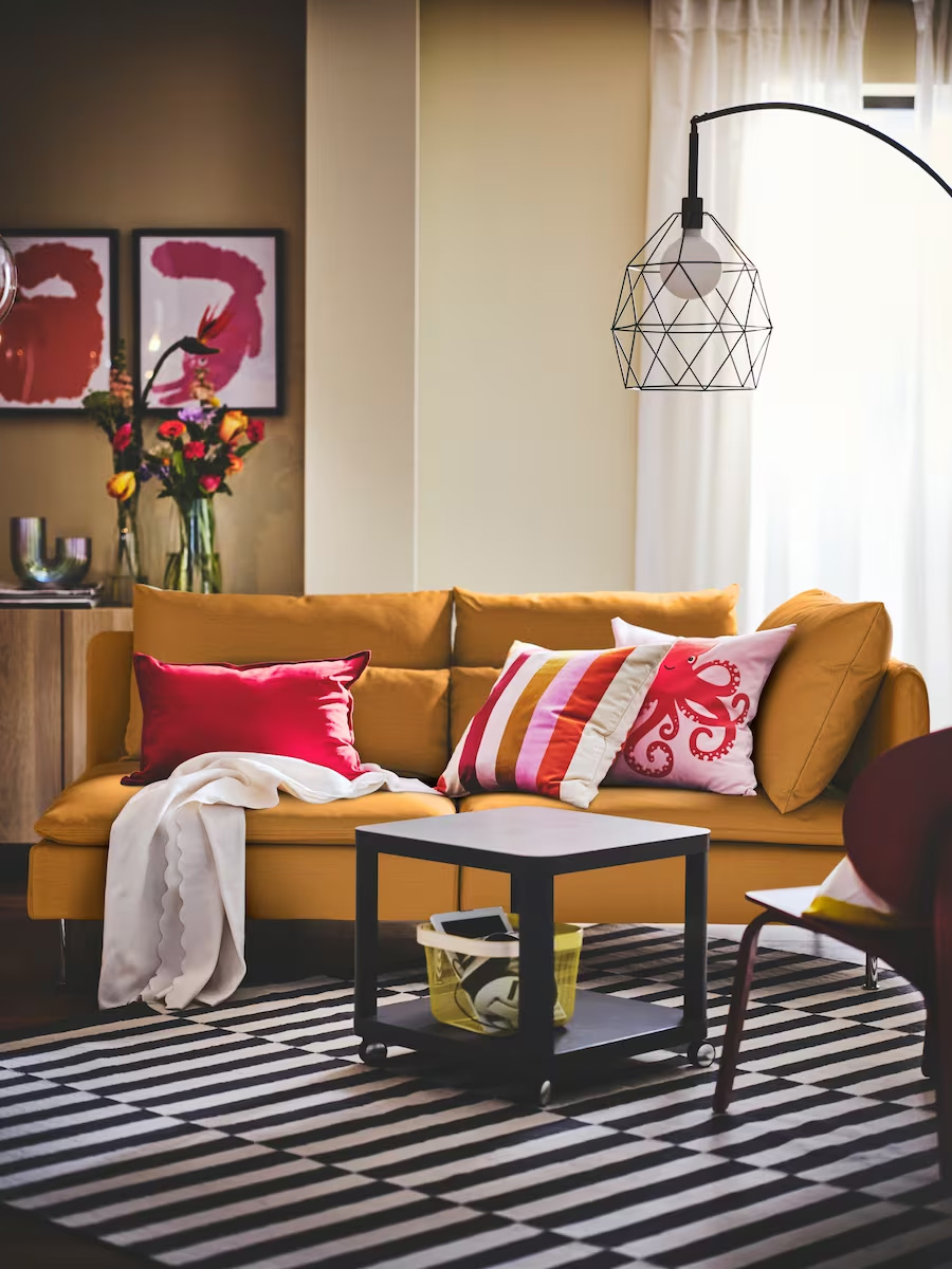 以鮮明對比佈置奪目的空間。可以先選擇有圖案的靠枕,再挑選顏色搭配,組合出更大膽奪目的效果。結合色彩柔和的織品來營造對比,增添溫馨暖意。一點粉紅色能平衡偏冷的色調,而淡綠色則與客廳佈置相襯,也增添清新感覺。