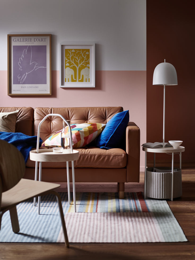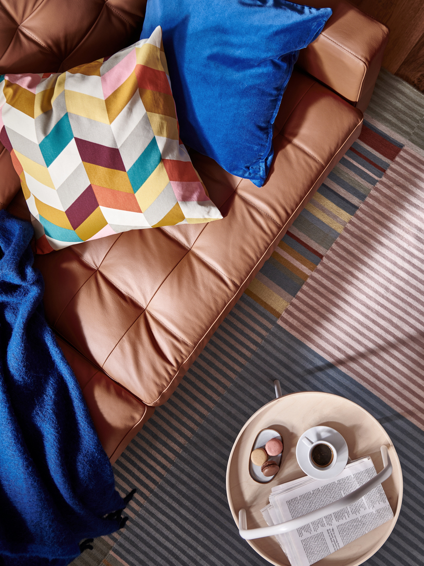 大膽嘗試對比色,例如用藍色靠枕和萬用毯來搭配棕色 LANDSKRONA 沙發,營造帶有鮮明活力的視覺效果;平靜的藍色調也能為其他顏色的靠枕、地毯和沙發創造協調一致的感受。