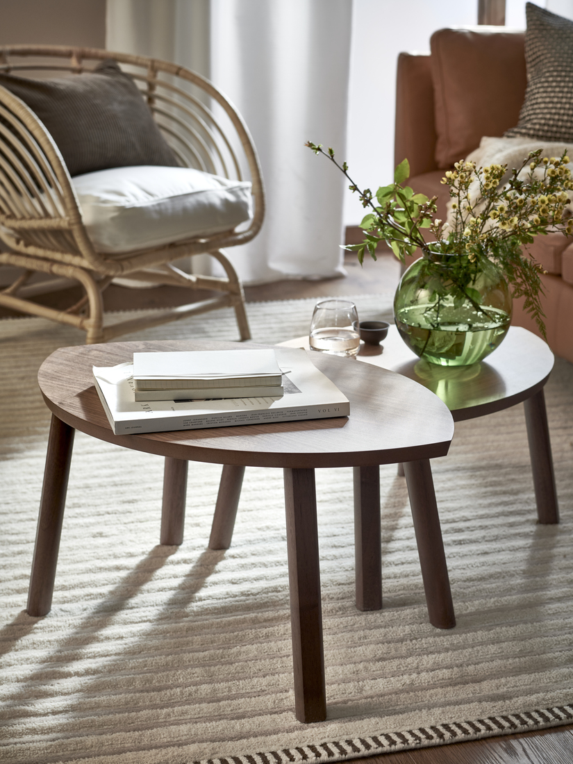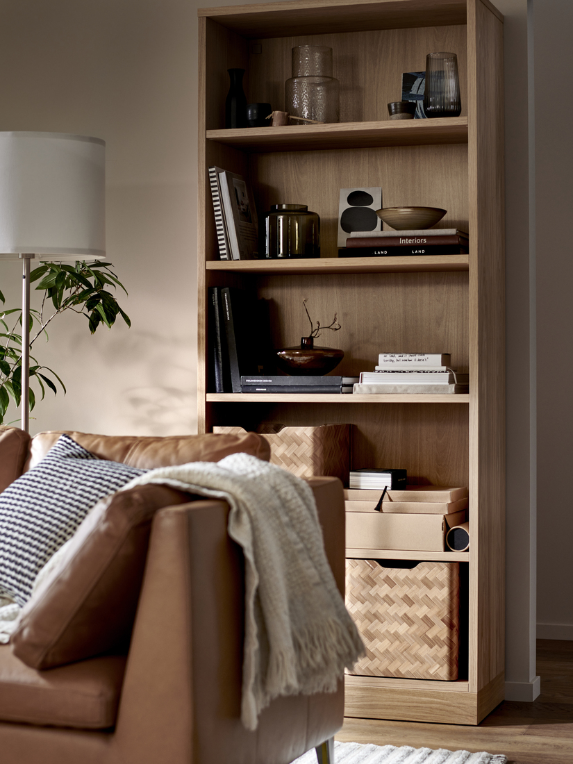 咖啡桌、邊桌和書櫃不僅提供方便的儲物空間,還能幫助你營造沙發周圍的整體風格。 小物件也能強化你所選擇的風格。在這裡,插著鮮花的花瓶和竹籃子,為這個區域增添了一份平靜、貼近自然的氛圍。