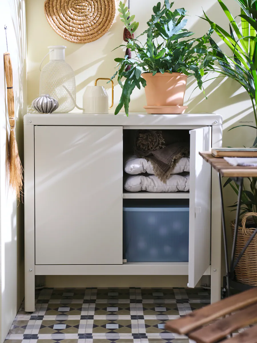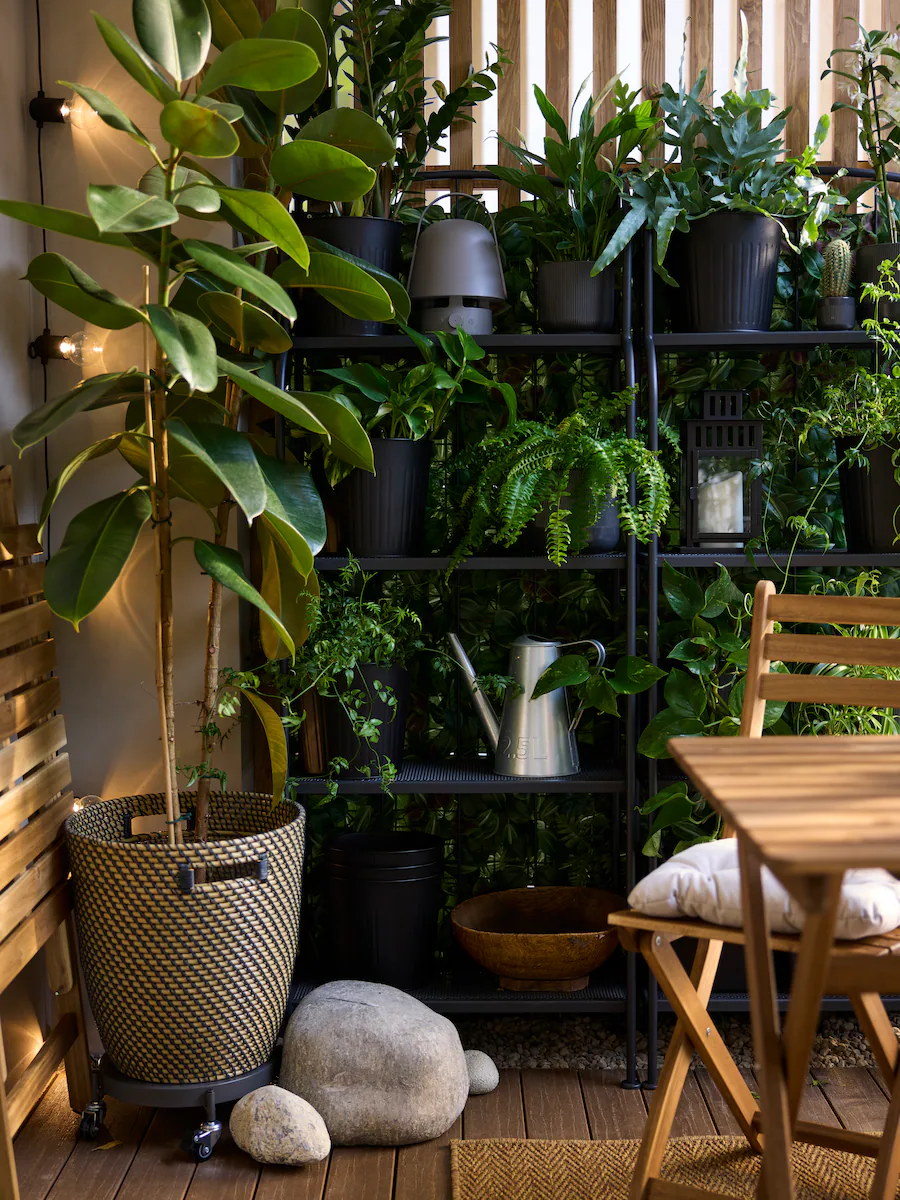 陽台植栽第一課:一個堅固寬敞的家。選擇耐用金屬家具(外層是塑膠也可以),來適應潮濕環境。搭配開放式層架或櫃子,擺放花盆、澆花壺和各種園藝工具,也能整齊收好裝著土壤、容易把地板弄髒的袋子。記得選擇和陽台收納相襯的同色系花盆,讓植物更搶眼。