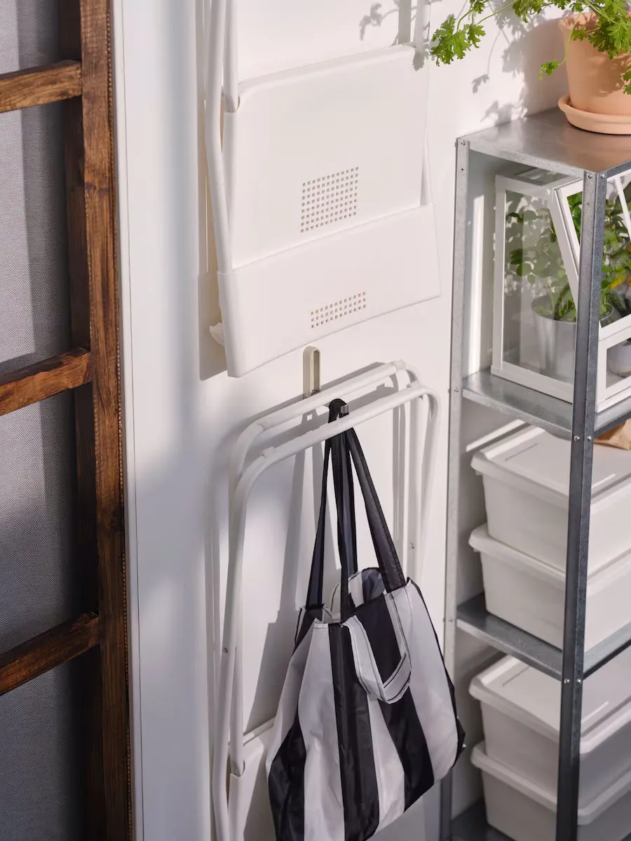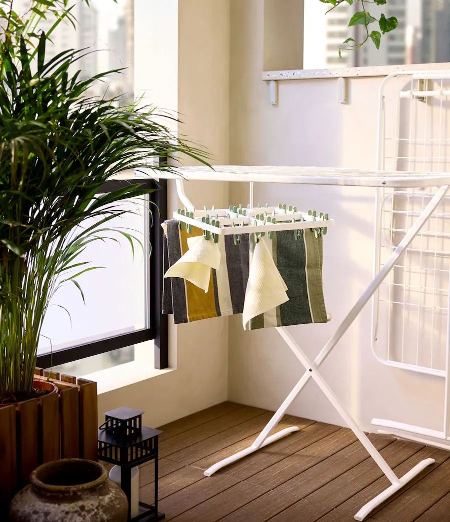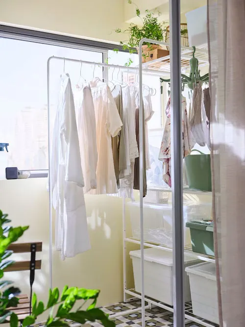 實用又近乎隱形,正是小陽台洗晾收納的關鍵。可摺疊的晾衣架,使用完畢後就輕鬆收起;或是固定在牆面的吊衣桿,幾乎和空間融為一體。用層架收好洗衣精、瓶罐、洗衣袋和曬衣架,打造整潔實用的生活小角落。