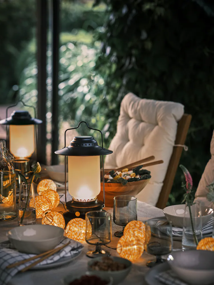 餐桌往往是聚會時大家停留最久的地方,因此不妨在照明上多花點心思。可調暗桌燈提供功能性照明,結合裝飾燈串,讓大家在寫意的環境下徹夜長談。