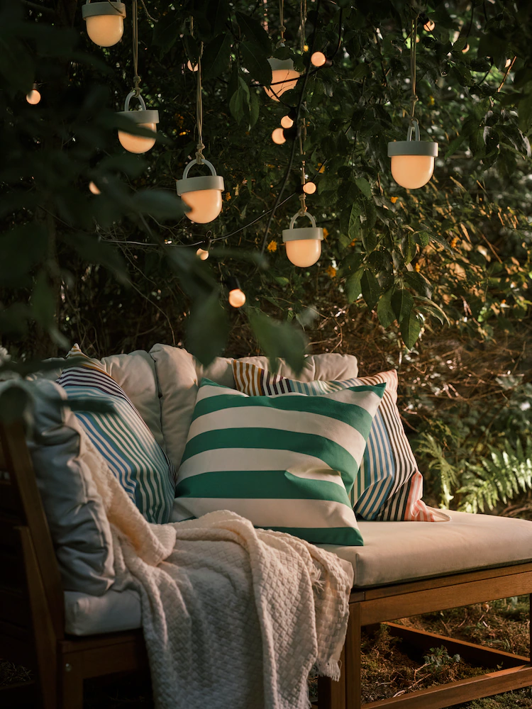 如果戶外空間有樹木或頭頂上有其他物品,只要掛上以電池操作的燈具和燈串,就能營造如繁星閃爍的效果。如此夢幻的氣氛,讓你與朋友能促膝長談。