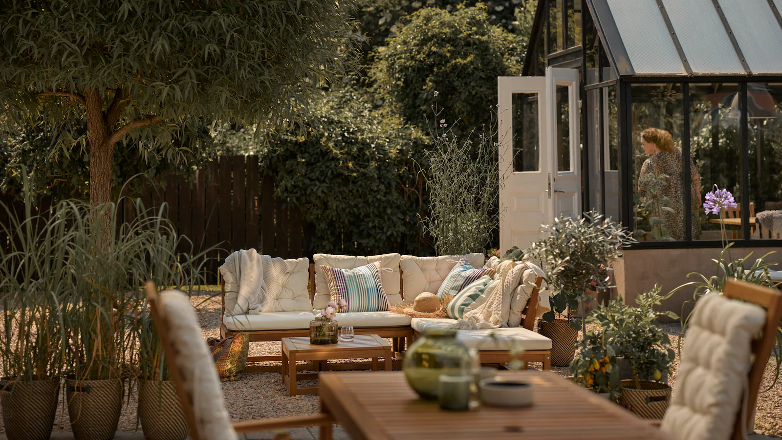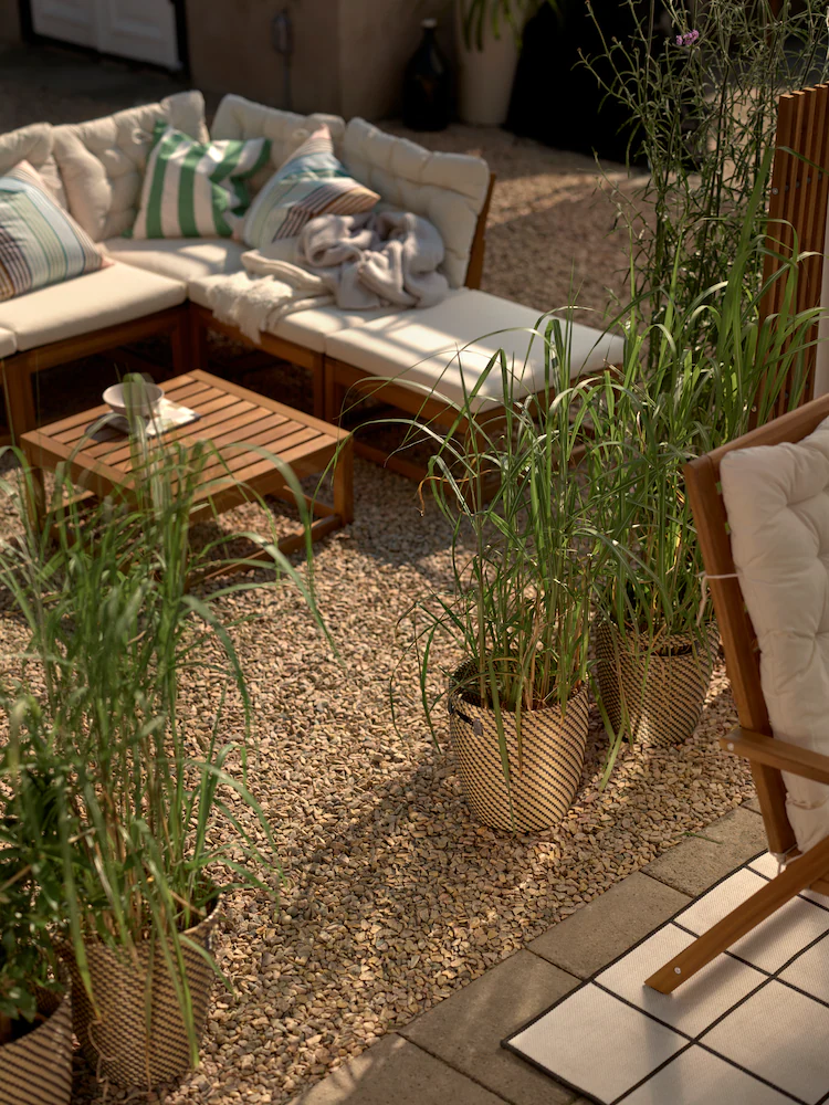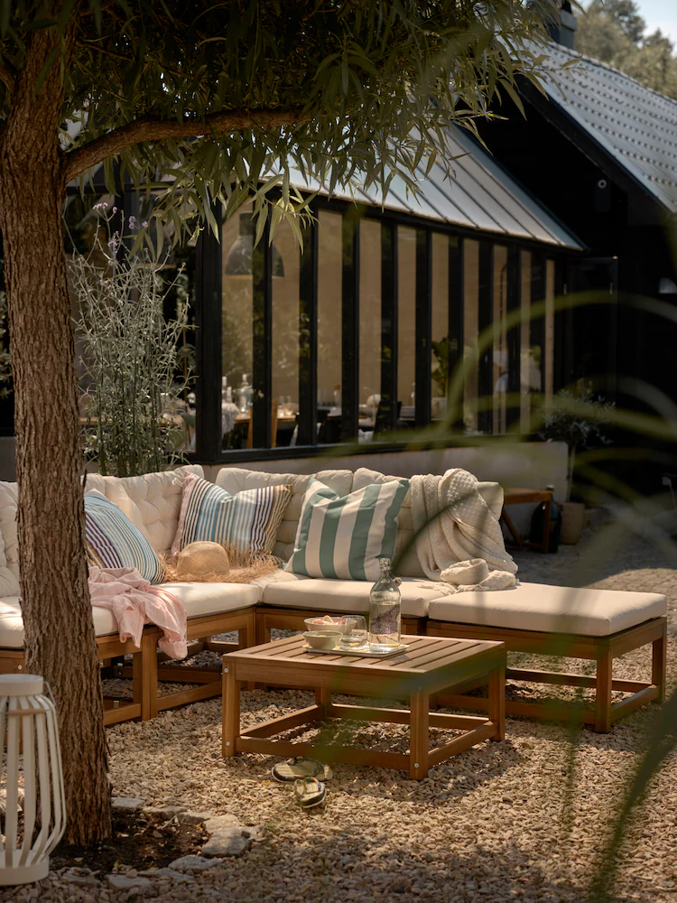 你可以隨意調整家具佈置,配合陽台的空間。這個戶外沙發組可以變成任何形狀和大小,也有相襯的獨立休閒椅,拆下背墊就變成一張腳凳,再拿掉靠枕就能當作邊桌使用。