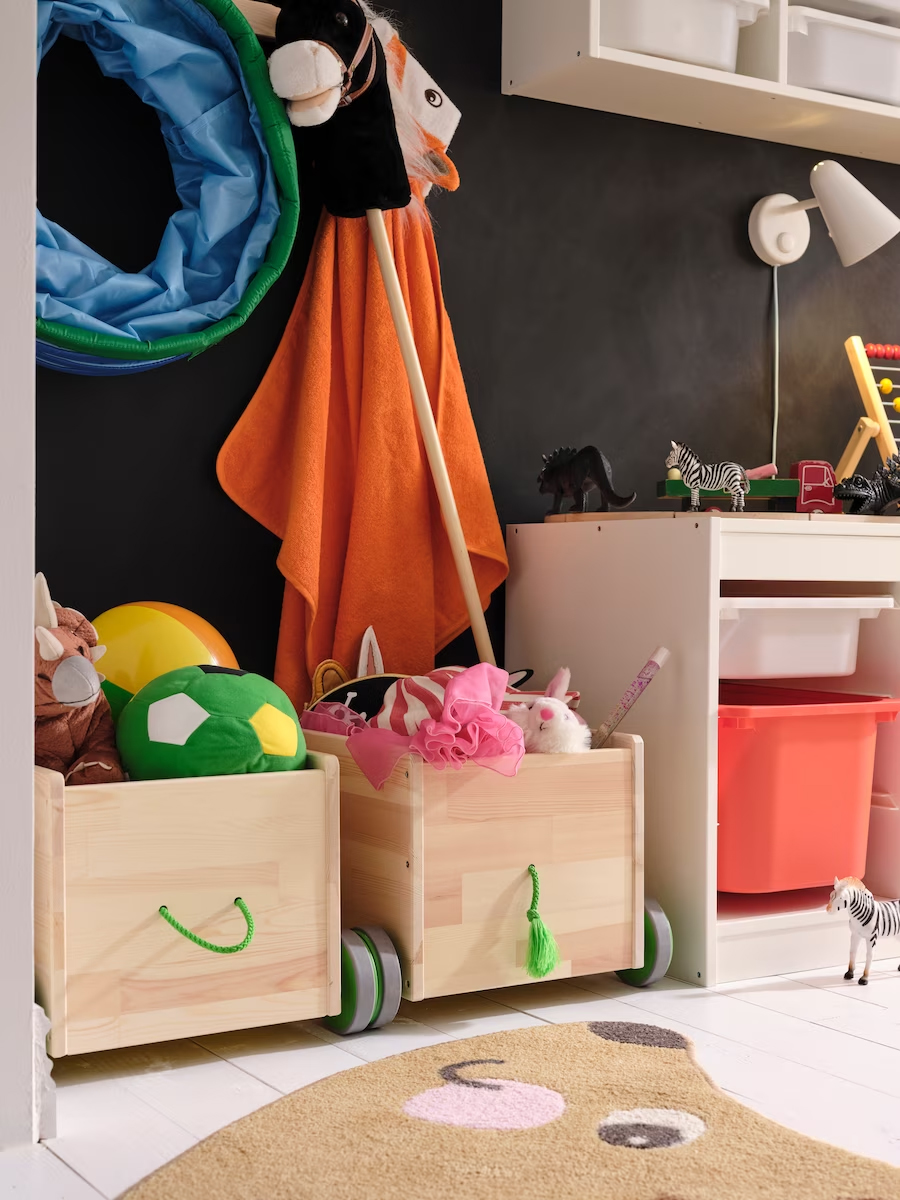 可移動的收納能讓收拾更輕鬆,俏皮的設計也能營造活潑的氣氛。分格收納盒可為兒童房注入新氣息,需要的時候也可推到角落置放。另外,使用帶輪腳的收納盒可以收集散落滿地的玩具,讓孩子和玩具都有屬於自己的「休息空間」。