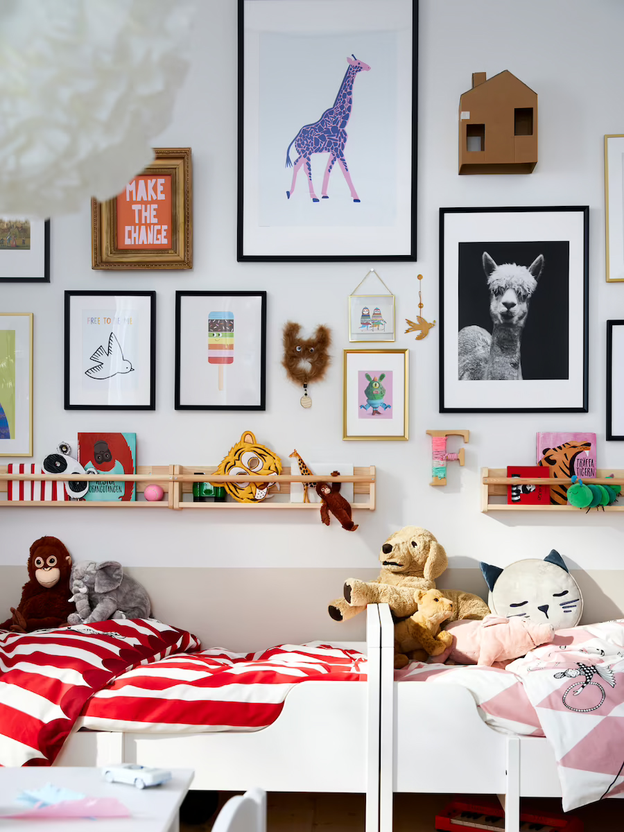 你可以採用簡單的層架或壁櫃收納,展示孩子喜愛的玩具、書本或毛絨娃娃,並且時不時進行替換。除了能營造活潑朝氣的氛圍,也能讓孩子輕鬆選擇想看的書或想玩的玩具。