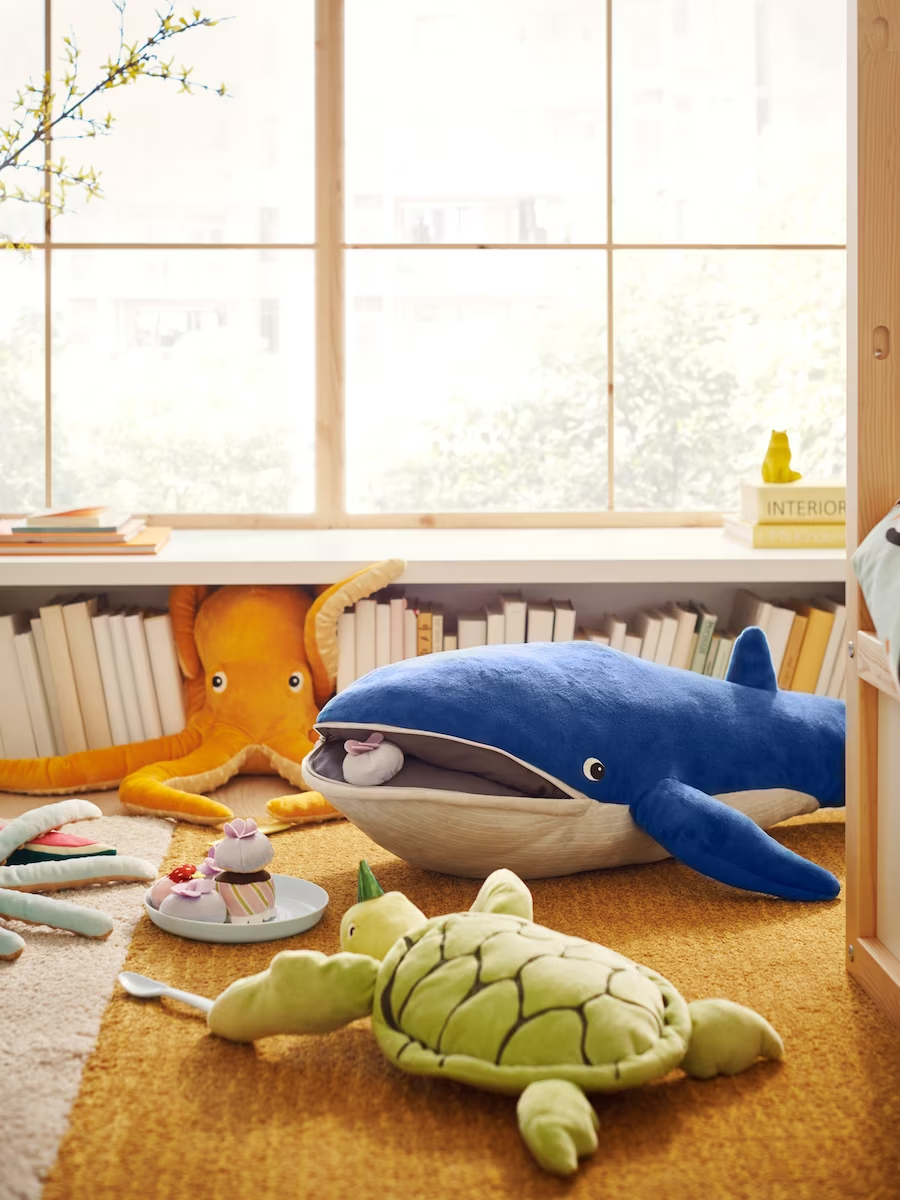 選用附帶收納功能的家具,就能立即收拾雜物,讓家事時間充滿樂趣。你也可以設計一些「收拾遊戲」,比如用玩具餵飽這隻鯨魚玩具。在歡樂音樂的襯托下,兒童房必定會是元氣滿滿。