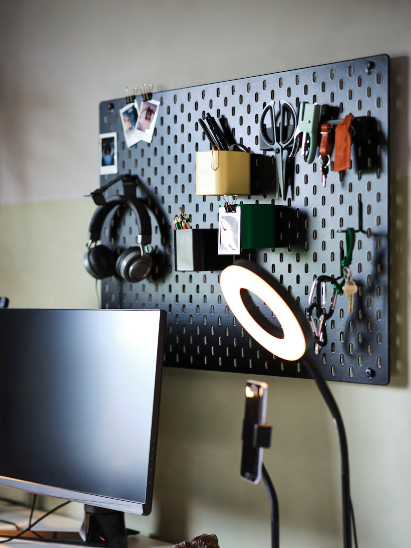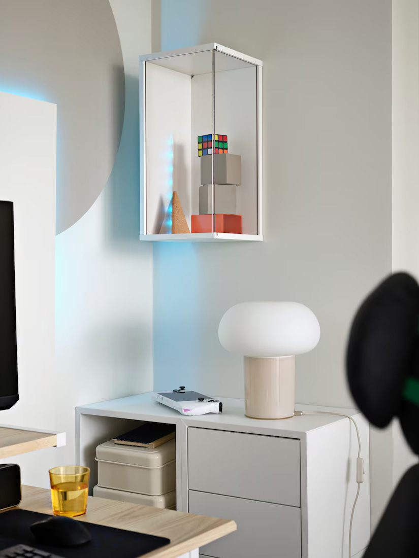 把公仔、限量版遊戲和DIY 作品(你現實生活裡的戰利品)整齊收在遊戲桌上方和周圍的展示櫃裡,隨時都能盡情欣賞,又方便維護。需要經常使用或想要展示的小物,像是除塵空氣刷、電池和鍵帽等,就用洞洞版或開放式壁櫃收好。