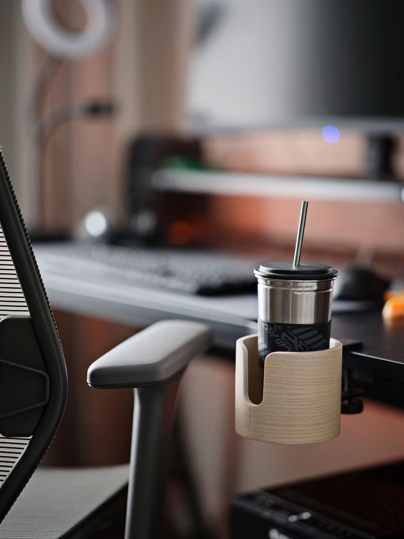 長時間打遊戲,更要關注健康。在手邊放置飲料和小點心(記得避免翻倒溢出),輕鬆補充能量。使用邊緣加高的大尺寸杯墊(也可用來放置碗盤),或者用夾式杯架放置飲料,確保桌面乾爽安全。