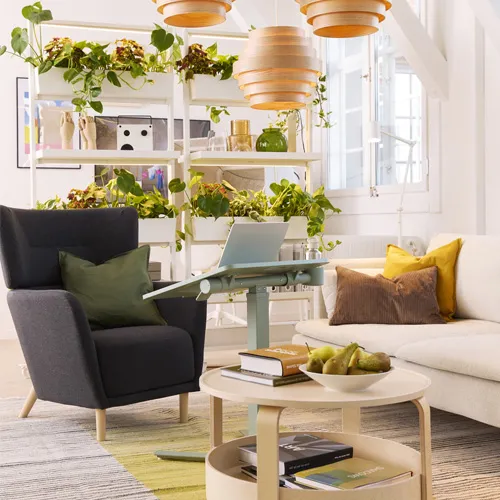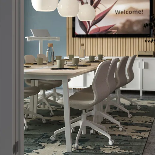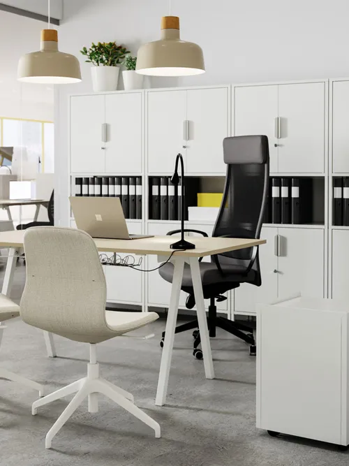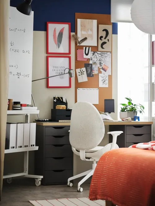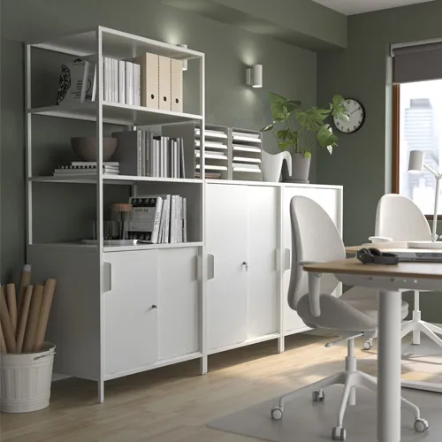 選用開放式層架不僅能做為收納儲物,更能營造空間的層次感。搭配絨布面的背板或是白板背板,張貼記事或是畫圖討論都十分便利。