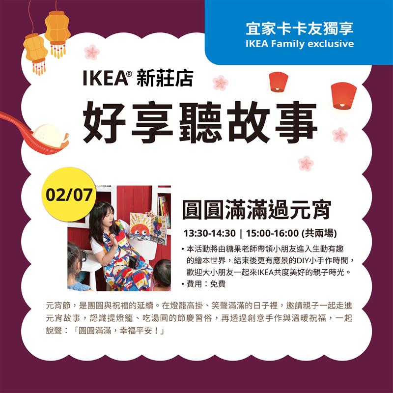 活動日期:2026年2月7日(六) 活動時間:幼兒組 13:30–14:30(3–5歲)、兒童組 15:00–16:00(6–10歲) 活動地點:IKEA 新莊店 3樓兒童活動教室