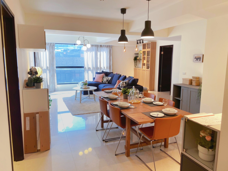 清爽舒適的住家空間是此案設計的核心,運用大量淺色元素家具,搭配少量木紋材質及深色燈具,塑造空間層次及視覺焦點。