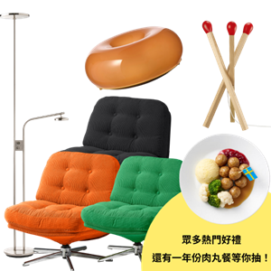 可獲得人氣話題爆品STRÅLA火柴燈、VARMBLIXT甜甜圈燈、DYVLINGE旋轉休閒椅(三色不挑款)、ISJAKT落地燈各1名,及最大獎一年份瑞典肉丸餐1名!(共5名)
