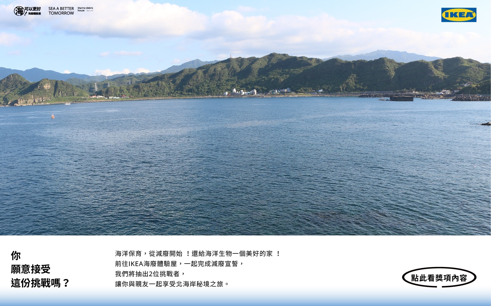 前往IKEA大台北地區4家分店參觀海廢體驗屋,於現場完成宣誓活動,並與海廢屋合照、公開上傳到個人FB、並輸入指定文字,即可獲得抽獎資格,有機會抽中北海岸一日遊行程!