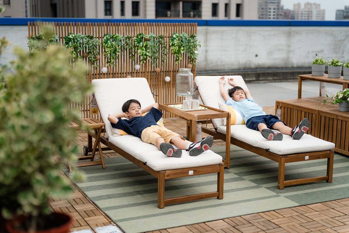 相思木材質的戶外桌椅,溫暖沉穩的木頭材質充滿愜意休閒感