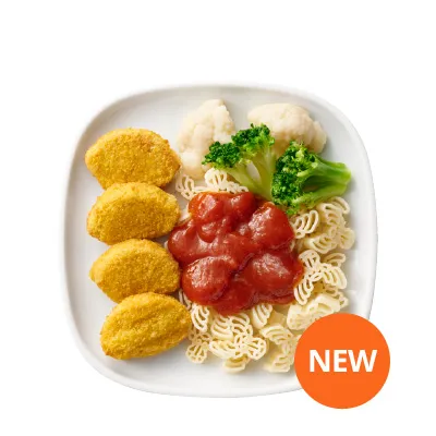 含小麥蛋白植物雞塊、麋鹿造型義大利麵、雙色蔬菜、番茄紅醬