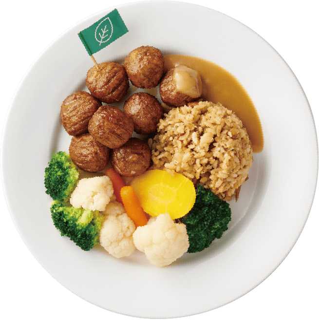 含植物素肉丸、醬油炒飯、綜合蔬菜、肉丸奶醬