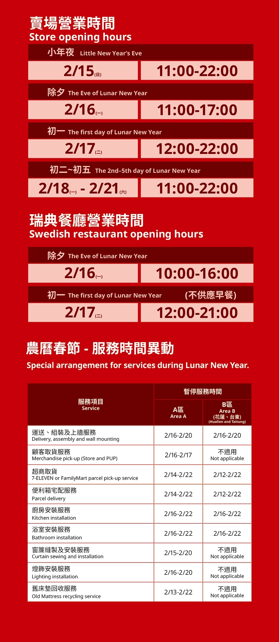 IKEA新店店 2026農曆春節 營業與各項服務時間異動